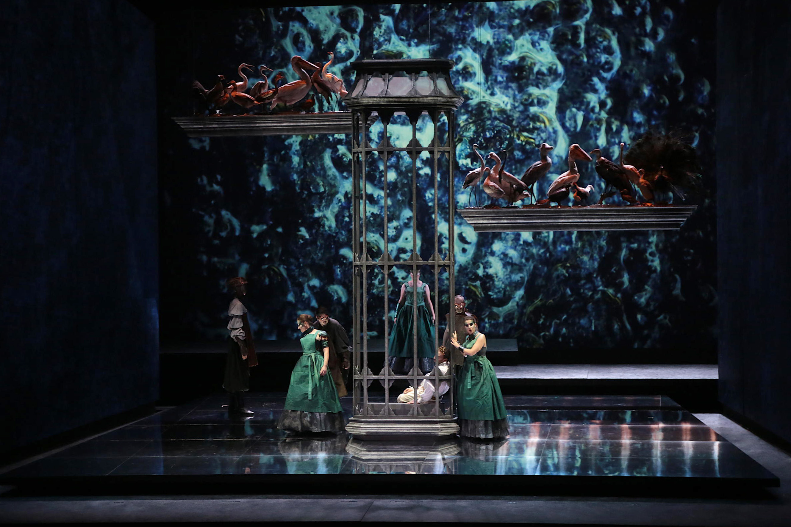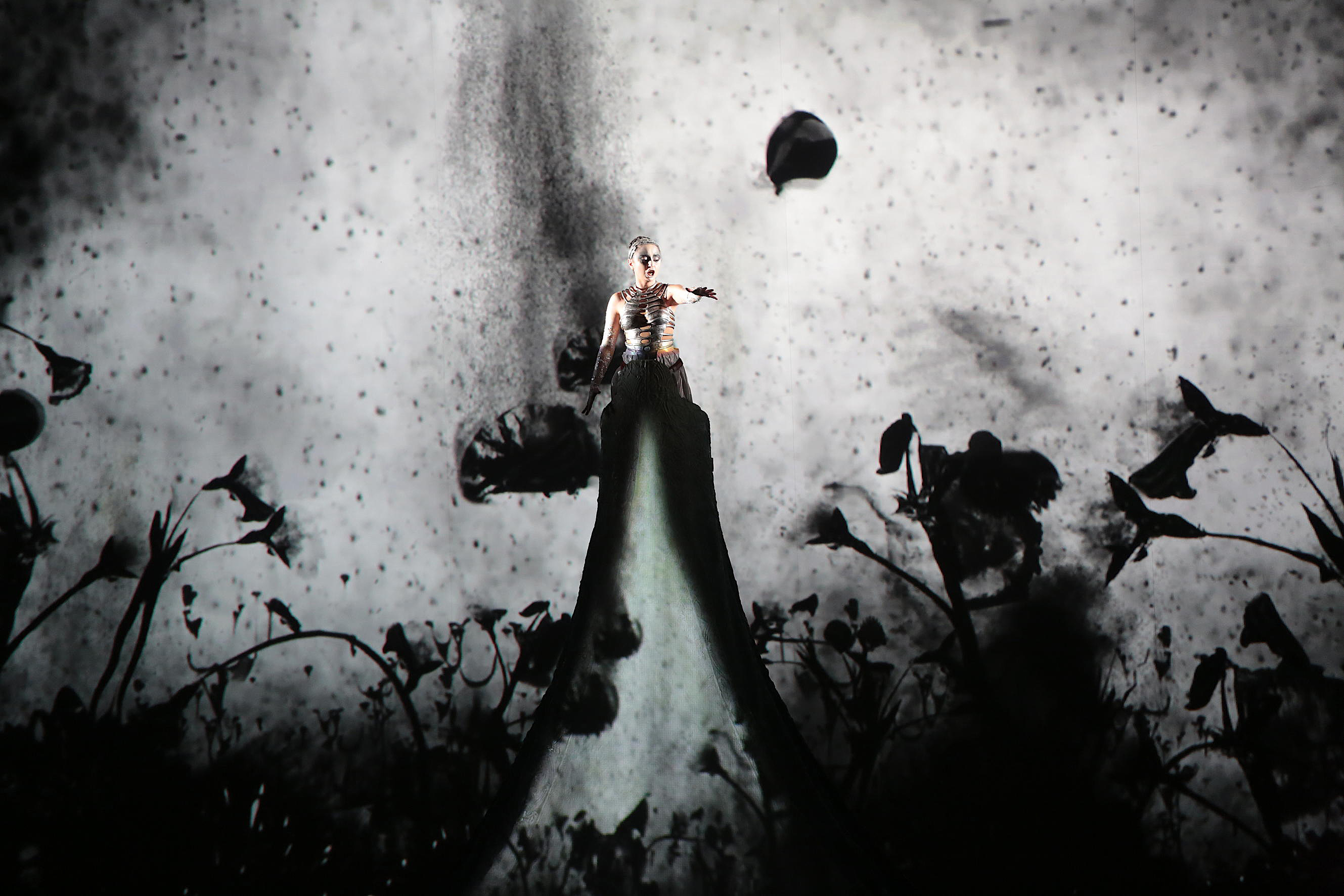 Chiamati a fornire il loro apporto nello spettacolo firmato per la regia da Mariano Furlani, per le scene da Giacomo Andrico e per i costumi da entrambi, i Masbedo nel primo atto costruiscono una sorta di video-installazione che parte dalle immagini di un grosso serpente in carne e ossa per iniziare un percorso naturalistico fra macro e micro (dai grandiosi paesaggi alberati al close-up su microorganismi, in un brulicare di insetti e gemmazioni, con frequenti sgocciolii di vari liquidi), fra vero e finto (molti degli animali che si susseguono nelle immagini sono impagliati). Non mancano parti più chiaramente “astratte”, in un frequente alternarsi di colore e di sfumature del grigio. Il momento più effettistico è riservato alla prima aria della Regina della Notte, che canta issata su una sorta di cono vulcanico e immersa in quello che appare un fondale marino sottoposto a continue turbolenze.