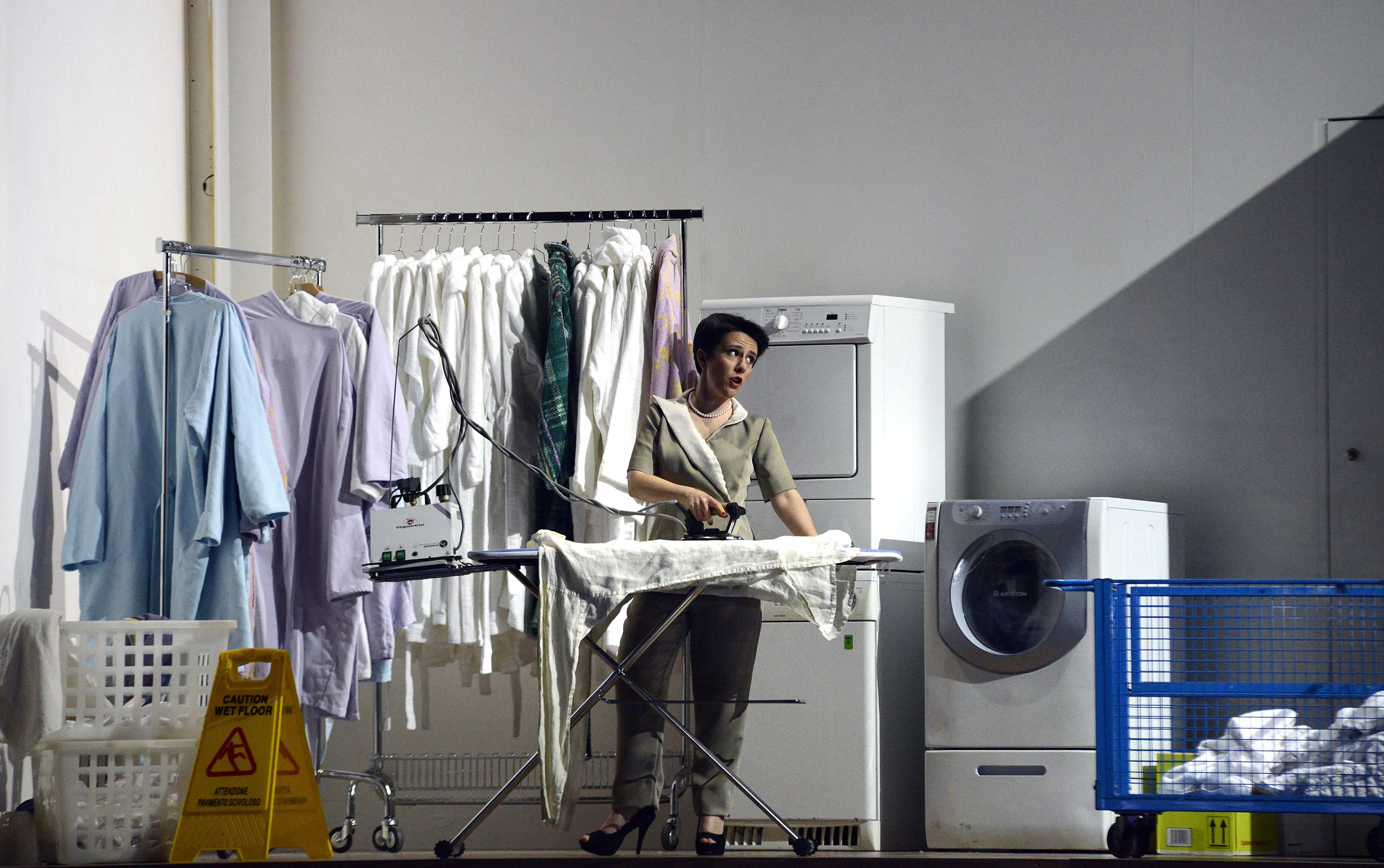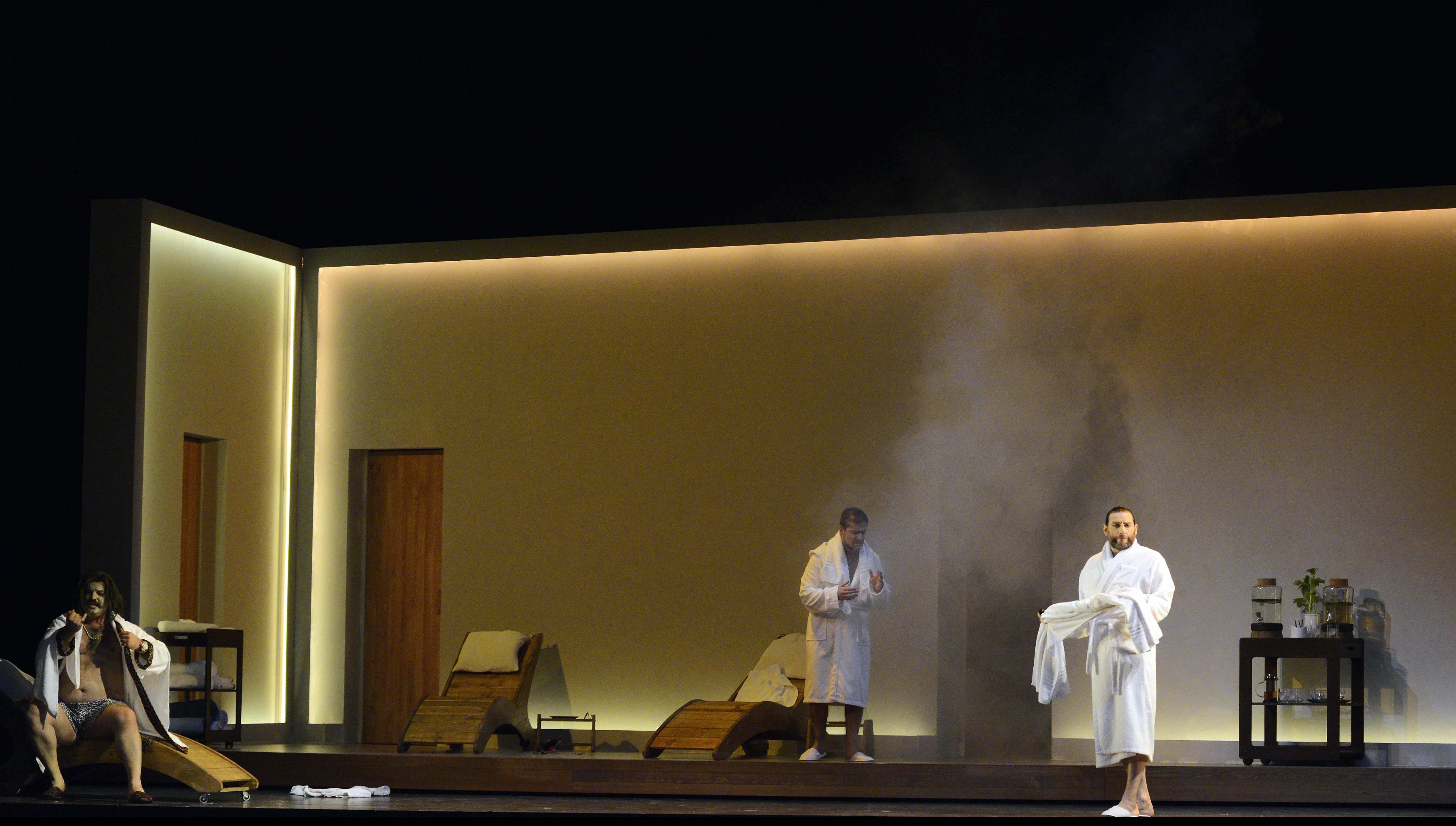 Lo spettacolo in chiave contemporanea firmato da Gianmaria Aliverta sottolinea bene questo aspetto. Dentro alla scena girevole di Massimo Cecchetto (grazie alla quale si passa in tempo reale da un ambiente all’altro dell’albergo con terme dove è ambientata la vicenda) e grazie anche ai costumi caricaturali di Carlos Tieppo, la vicenda vede agitarsi intorno alla protagonista una galleria di “tipi” molto caratterizzati e spesso grotteschi, che vanno oltre i tic della modernità (speriamo si arrivi presti a una moratoria dei selfie in scena…) per definire una comicità valida per qualsiasi epoca, visto che il tema è l’eterno confronto sentimentale e il ruolo che può o deve assumervi la donna.