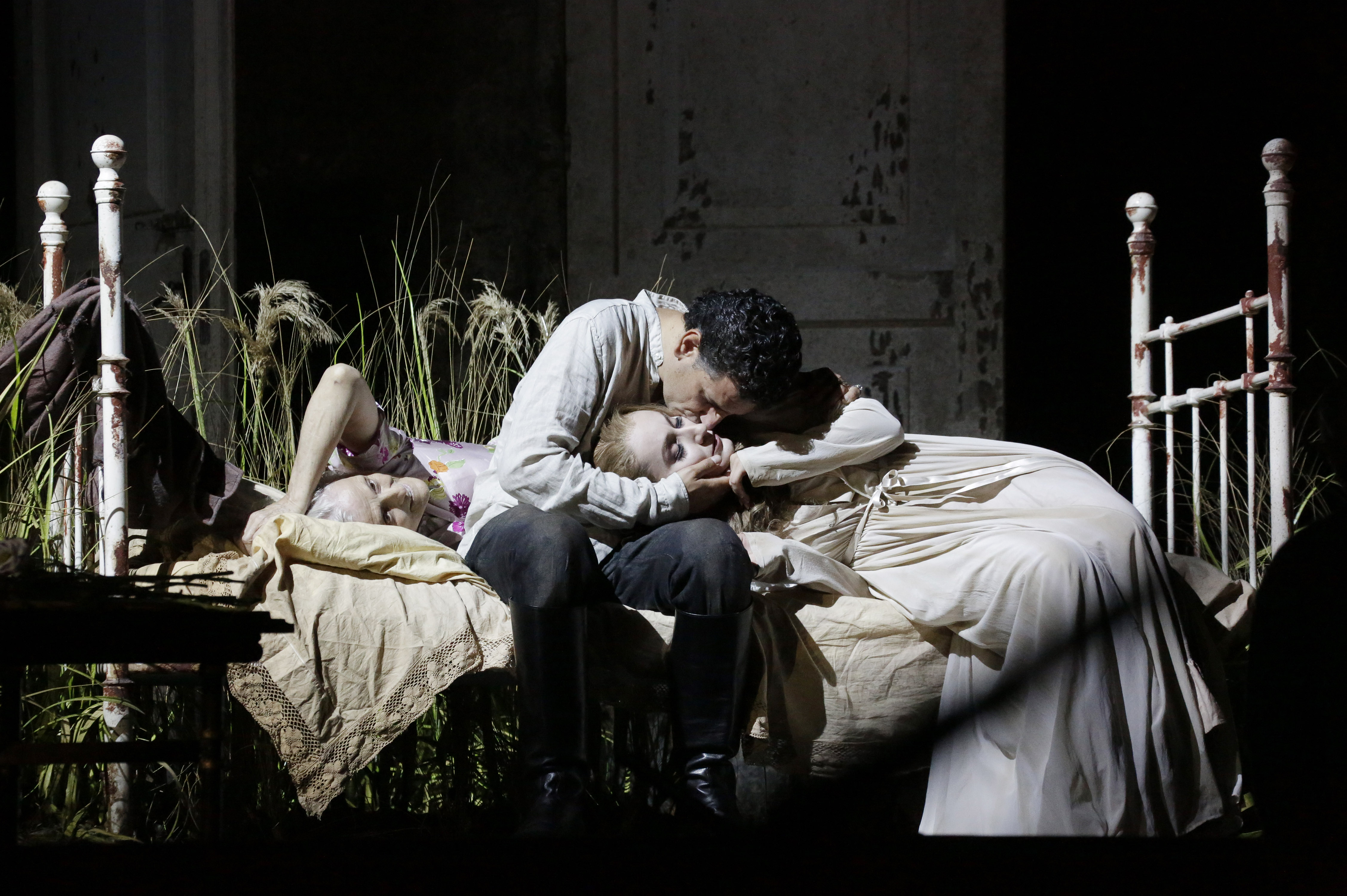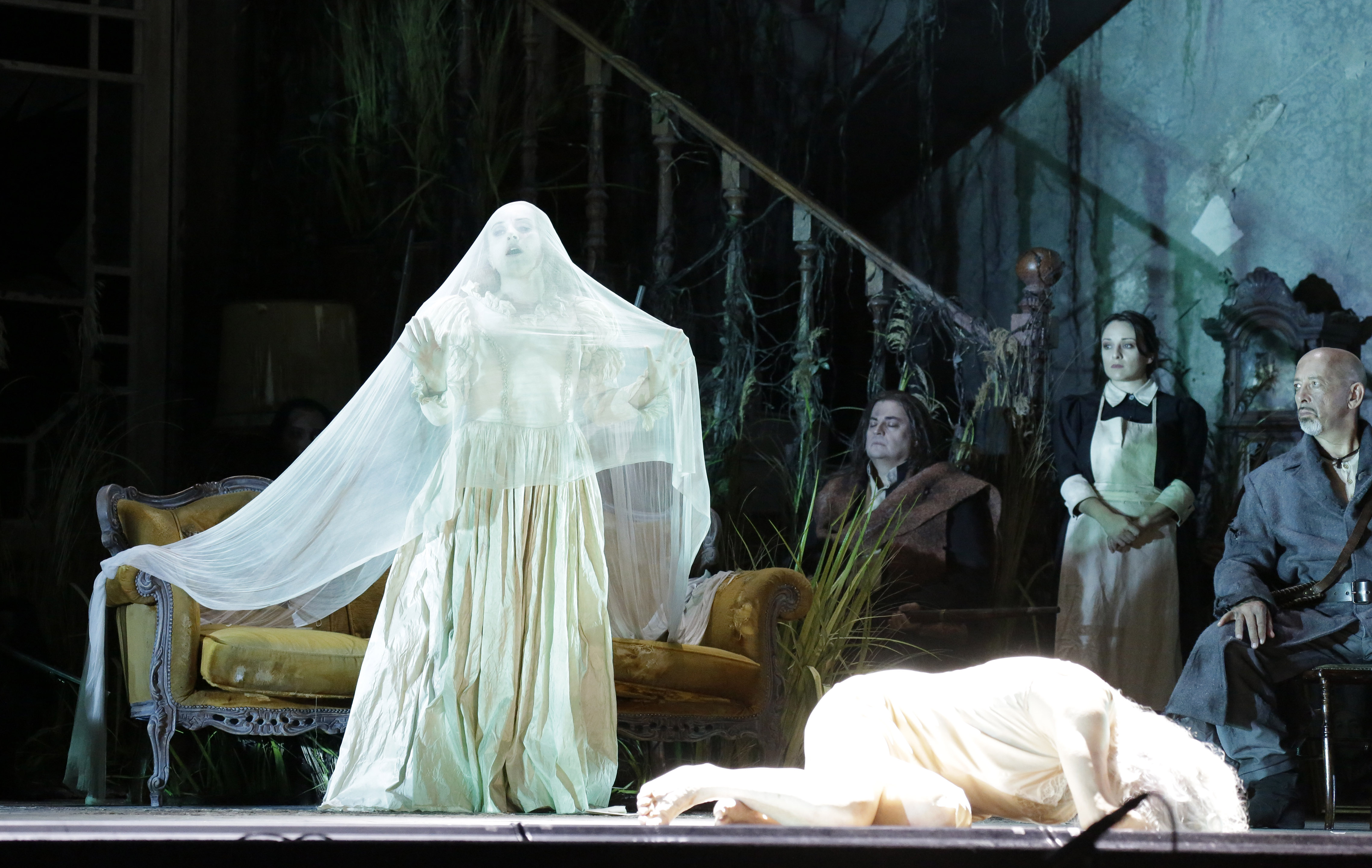 Da qui parte l’originale e complessa rivisitazione della “Donna del Lago” approntata dal regista Damiano Michieletto, star veneziana del teatro d’opera internazionale, per lo spettacolo inaugurale del Rossini Opera Festival di Pesaro, giunto alla trentasettesima edizione. Scomparsa, se non nel finale, la pervasiva cornice naturalistica dell’opera, la vicenda viene raccontata come una sorta di “ricostruzione mentale”, da parte della coppia consegnata al lieto fine, dei lontani eventi che hanno portato i due a una lunga vita coniugale. Nelle “stanze” della loro memoria, come in una forma di autoanalisi, tutto si svolge in un interno in disfacimento (abilissimo come sempre lo scenografo Paolo Fantin), una casa le cui finestre non hanno un vetro sano, i muri sono scrostati, il piano superiore cui conducono scale traballanti ha addirittura il soffitto sfondato. Lo stanzone sta per essere invaso dalle erbacce; fuori, in una costante oscurità, s’intuisce un lago che non è un poetico specchio d’acqua, ma un melmoso acquitrino.